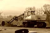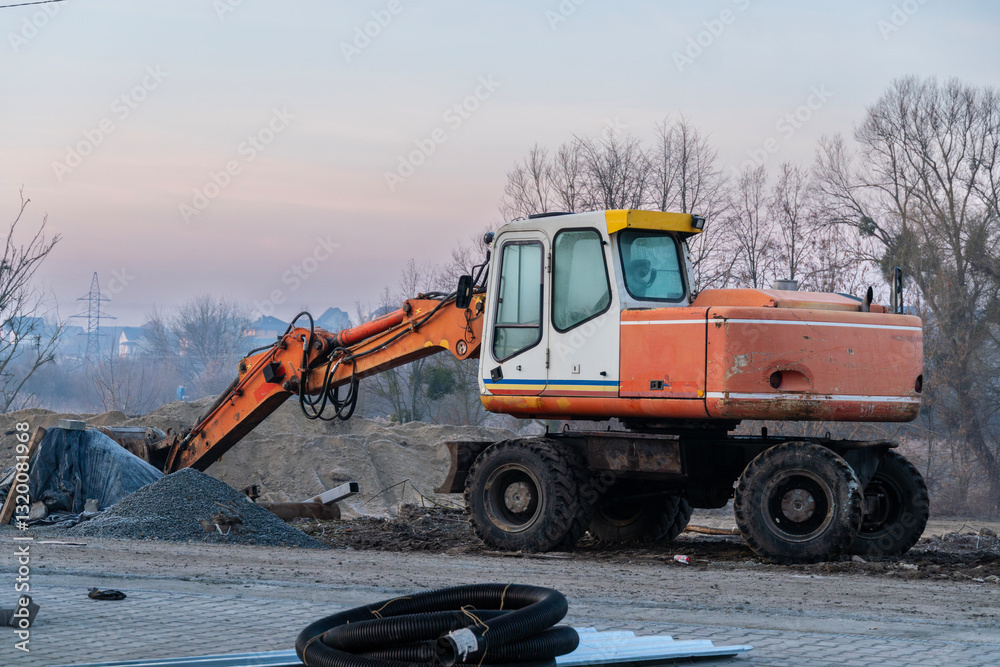 Heavy equipment operates at a construction site during early morning hours, moving gravel while surrounded by bare trees and a soft sunrise