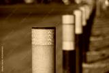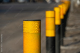 Traffic bollards in contrasting yellow and black are positioned along a city street, providing safety and guidance for pedestrians and vehicles in daylight