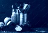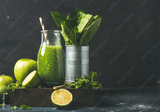 Green smoothie in bottle with apple, romaine lettuce, lime and mint, dark background, selective focus, copy space. Detox, dieting, clean eating, vegetarian, vegan, fitness healthy lifestyle concept