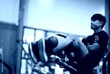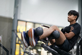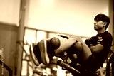 Asian man doing sit-up abdominal exercises in gym.