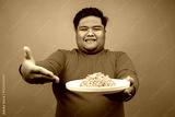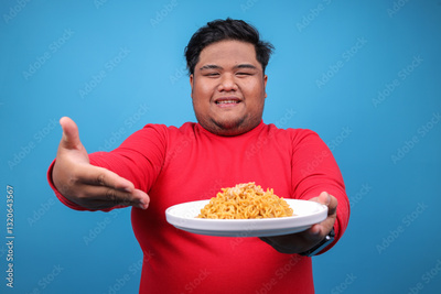 Portrait Of Fat Guy Presenting At A Plate Of Fried Noodle Over Blue Background