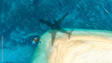 Aerial view of shadow passenger plane silhouette and sandy beach blue sea with waves at sea beach summer vacation sea travel concept