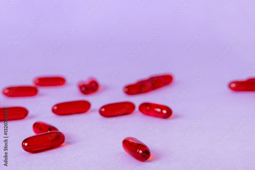Heap of red pills on colored background. Tablets scattered on a table. Pile of red soft gelatin capsule. Vitamins and dietary supplements concept