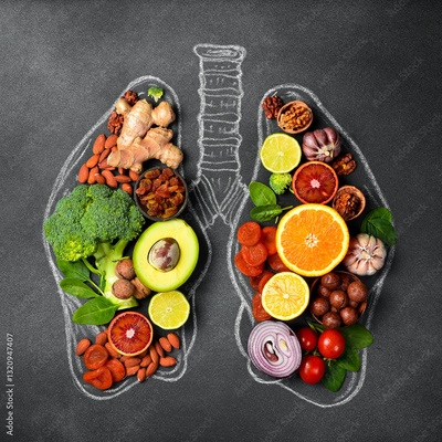 Healthy food concept for lung and breathing health. Fresh organic vegetables, fruits, nuts and dried fruits. Top view.