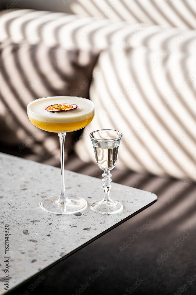 A stylish cocktail with a passion fruit garnish sits next to a small glass of clear liquid on a textured table, with soft shadows from the surrounding decor.