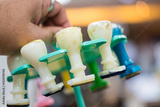 Close up man chooses plastic stamping from holders stamp in the office