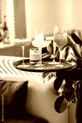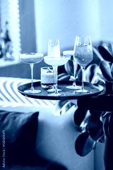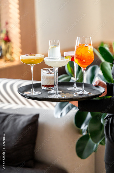 A person holds a black tray featuring an array of colorful cocktails, showcasing a vibrant selection of drinks against a stylish interior backdrop with greenery.