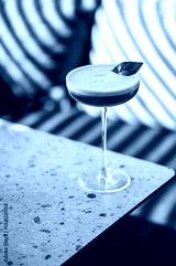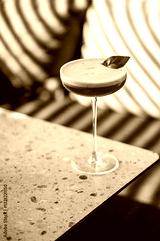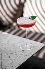 A stylish cocktail glass featuring a vibrant red drink garnished with a green leaf, placed on a textured stone tabletop, illuminated by soft shadows.