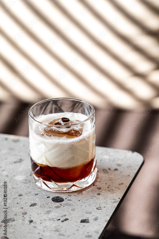 A close-up of a stylish glass filled with a creamy coffee drink, featuring a layer of frothy milk on top, placed on a textured table with soft shadows in the background.