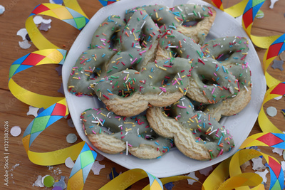 Many cookies in the shape of a mask with Pistachio glaze on a plate on wooden table with confetti and paper serpentine