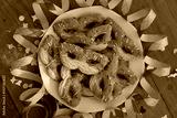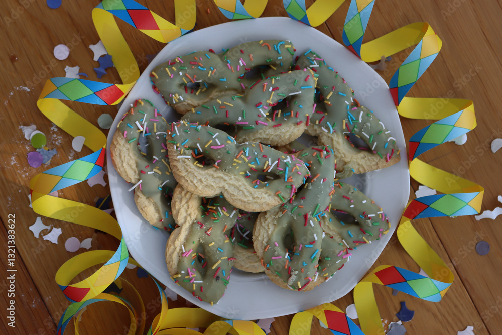 Many cookies in the shape of a mask with Pistachio glaze on a plate on wooden table with confetti and paper serpentine