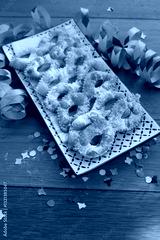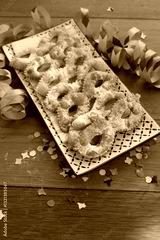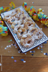 Italian sweet crisp pastry deep-fried and sprinkled with sugar in shape of Carnival mask on a tray. Chiacchere or crostoli, bugie, cenci with confetti and paper serpentine