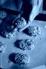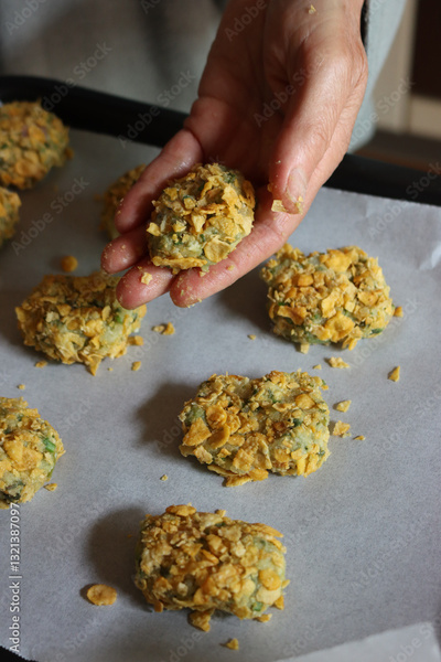 Close.-up of vegetarian balls made with zucchini and corn flakes on a baking tray