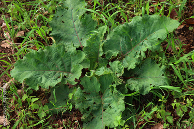 Arctium lappa. Young green burdock leaves in the italian countryside on summer