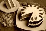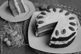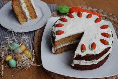 Sliced homemade carrot cake with mascarpone cream cheese icing and mini marzipan carrot decorations with Easter eggs and decorations