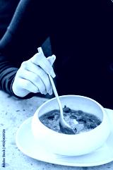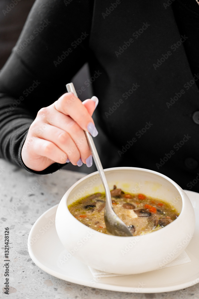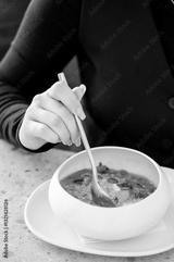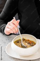 A close-up of a person's hand holding a spoon while enjoying a bowl of soup, featuring vegetables and herbs, placed on a stylish table.