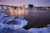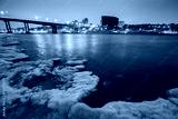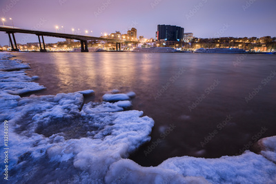 winter landscape of the river and view of the evening city.
