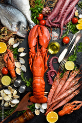 Lobsters, fresh fish and seafood on a slate stone background in the market. Top view.