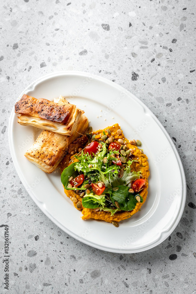 A vibrant plate featuring a colorful salad atop a creamy orange spread, garnished with seeds and cherry tomatoes, accompanied by crispy bread on a textured surface.