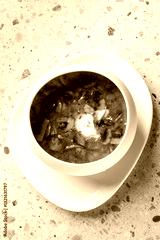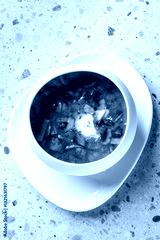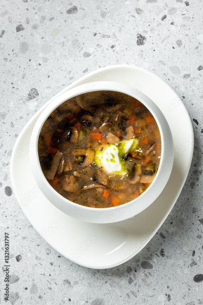 A delicious bowl of soup featuring vegetables, mushrooms, and a poached egg, served in a sleek white dish on a light textured surface.