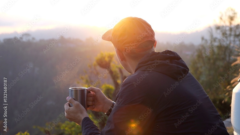 Male hiker wearing orange cap savoring hot beverage at sunrise, overlooking expansive mountain valley with serene landscape and golden morning light