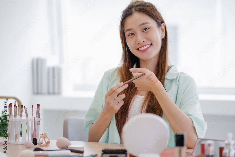 Beauty blogger. Cheerful asian vlogger is showing cosmetics products giving advices for her beauty blog.