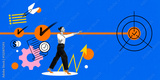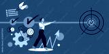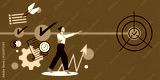 Businesswoman confidently walking towards target, surrounded by success symbols, gears, financial icons. Concept of goal setting, strategy, leadership, business plan. Contemporary art collage.