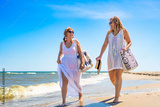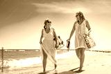 Two beautiful mature women walking on white sandy beach in summertime. Front view