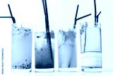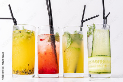 Four glasses filled with refreshing cocktails display an array of vibrant colors and flavors
