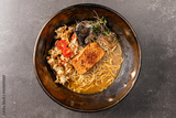 Savor a delightful bowl filled with tender noodles, grilled salmon, and vibrant vegetables