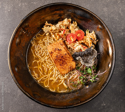 This bowl has tender ramen, grilled salmon, and vibrant toppings for a delightful experience