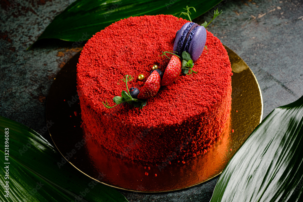 Rich red velvet cake adorned with vibrant strawberries offers a tempting dessert experience