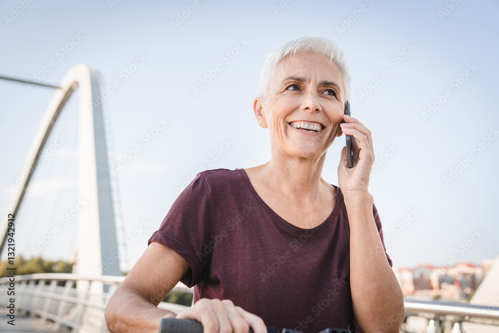 Close up of woman mature senior caucasian standing outdoor using mobile phone talking speaking with family by electric kick scooter in day confident modern alternative mode of transport copy space