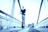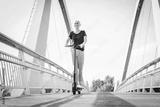 one woman mature senior caucasian female standing on electric kick scooter in day riding driving in town or city e-scooter eco friendly mode of transport real people copy space full length
