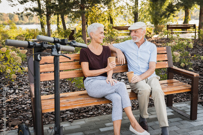 Senior couple sits on a park bench, chatting and drinking coffee resting after ride. Two electric scooters stand nearby, sunny day greenery. An active retirement eco lifestyle concept
