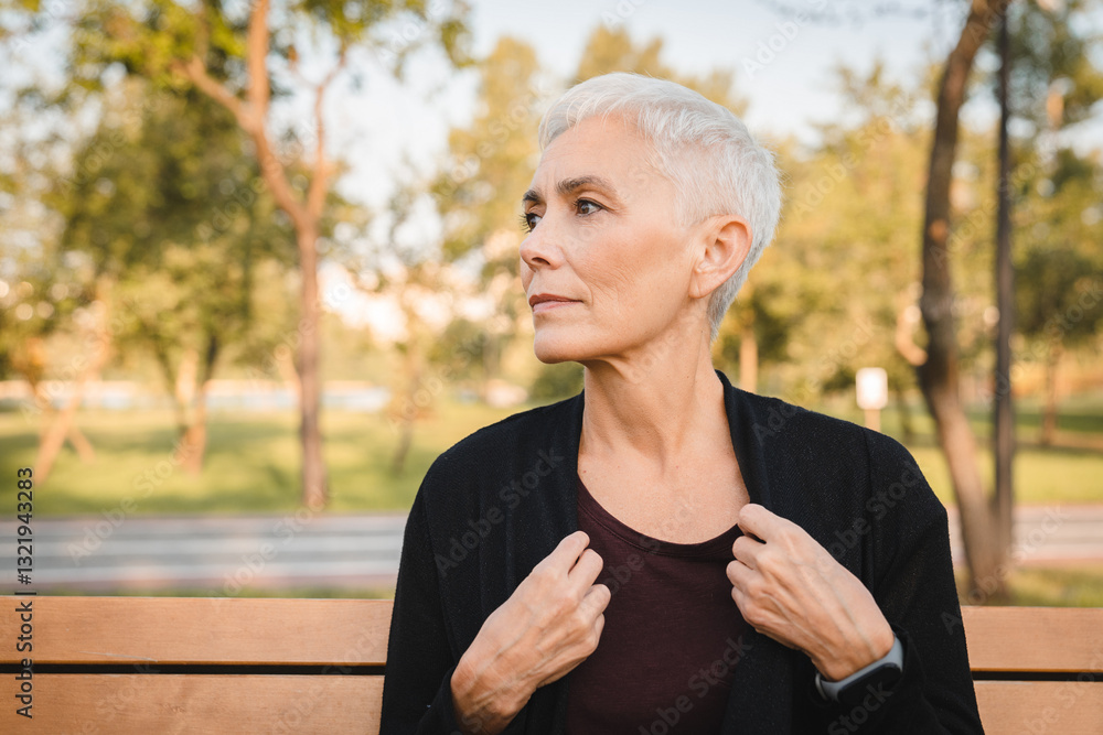 A thoughtful senior woman looking away takes pleasure in a serene moment within a picturesque park, where she is surrounded by an array of vibrant, colorful leaves that enhance the scene copy space