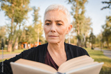 Dreamy modern old lady relaxing city park. Pensive senior gray haired woman casual sitting wooden bench outdoors reading book. cycling forest park, bicycle, healthy active lifestyle after 60 years