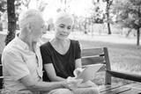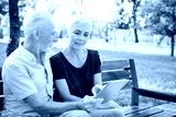 Caucasian senior elder couple sit on bench in park using digital tablet pad. Old man and woman look each other and smile with love together. Retirement warm family lifestyle concept.