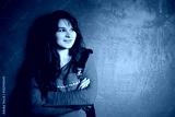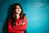 young woman in a beauty blouse and black jacket standing against the backdrop of a blue wall and crossed her arms