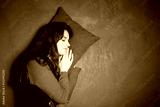 brunette woman in a red blouse leaning against a pillow in the blue wall and sleeps. Young woman sleeping on a pillow