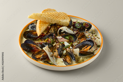 Elegant Culinary Presentation of Mussels in Cream Sauce with Sophisticated Styling and Lighting
