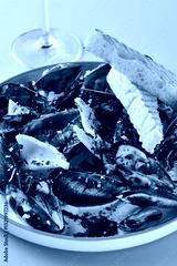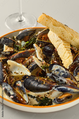 Elegant Mussels in Creamy Sauce with Rustic Bread - Warm Tones and Soft Lighting