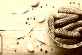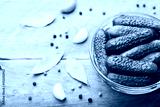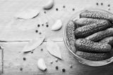 Pickled gherkins or cucumbers in bowl on wooden rustic table.