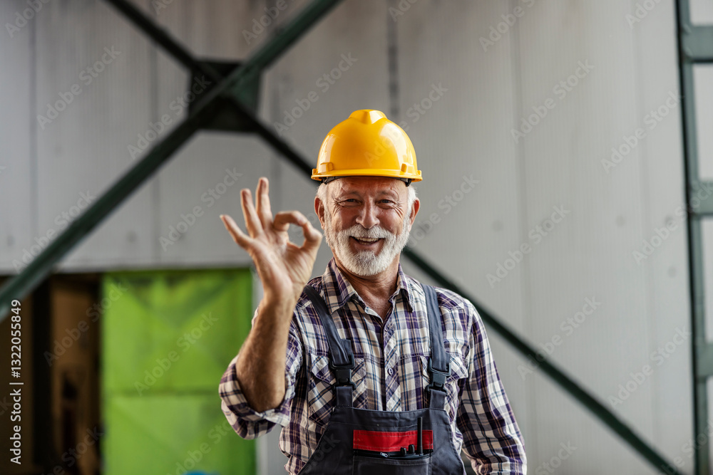 Portrait of senior industry worker standing in facility and gesturing okay at the camera.
