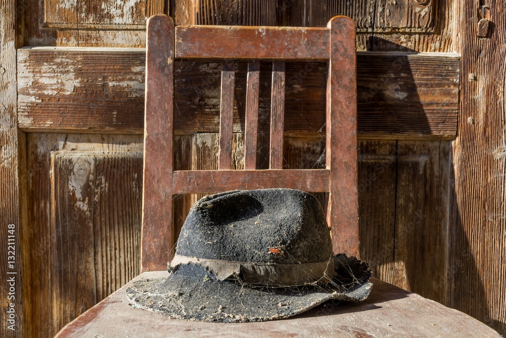 Battered old hat damaged by clothes moth on vintage background. A forgotten hat covered with spider web among the ruins of a house. Imagine the owner of this hat and tell their story.