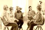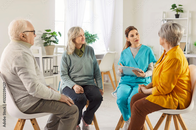 Friendly young nurse, caregiver or psychologist woman having conversation with a group of senior people sitting in a circle. Psychological support for retirement people in nursing home.