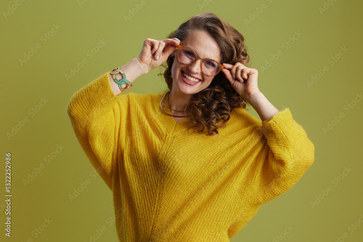 happy female in sweater and glasses on green