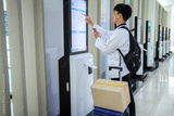 Asian Man Holding Mobile Phone While Using Self Service Check-in Machine at Airport. Flight to Hometown During Ramadan Celebration.