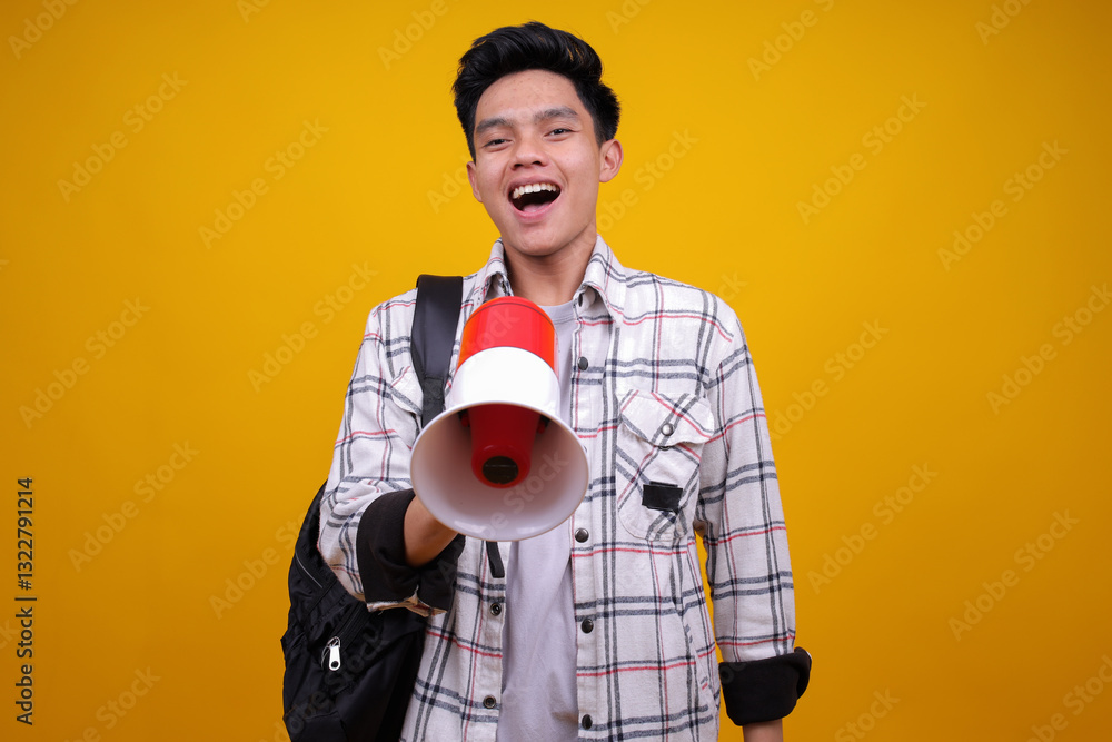 Cheerful Young Asian Student Wearing Backpack Shouting Use Megaphone Over Yellow Studio Wall