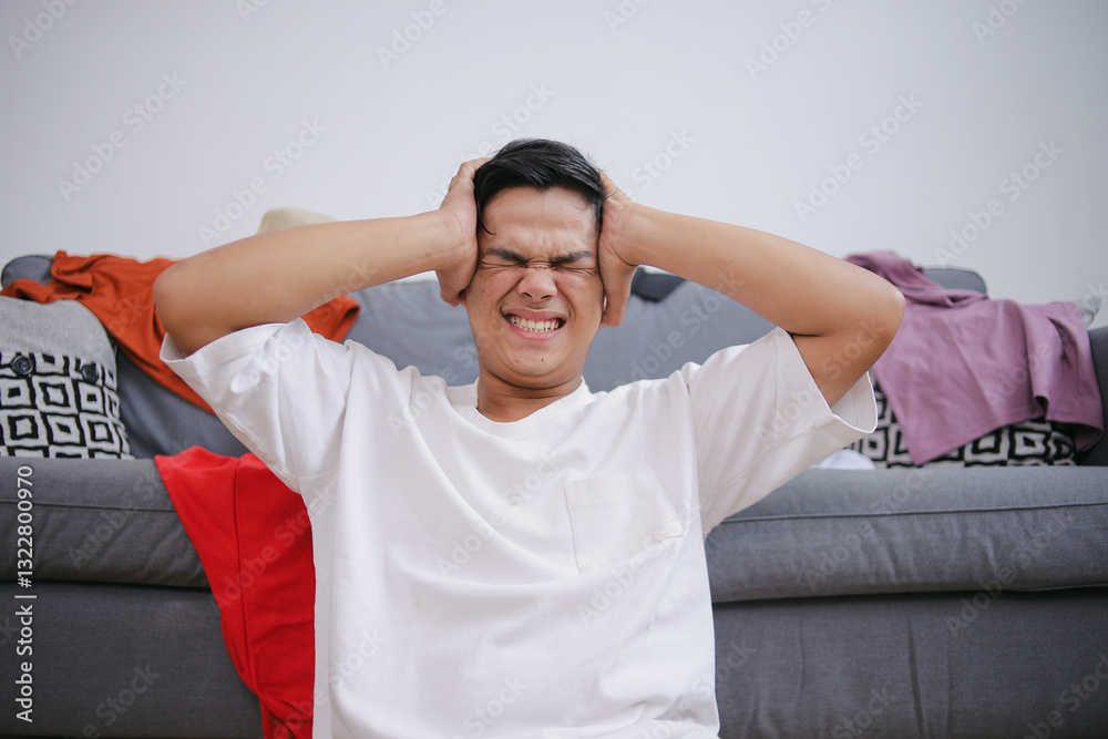 Close-up Of Young Man Stress With The Messy Clothes At The Room